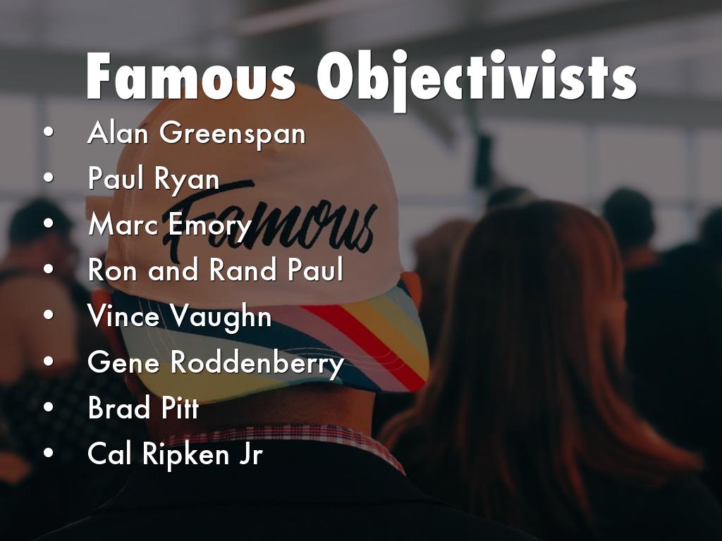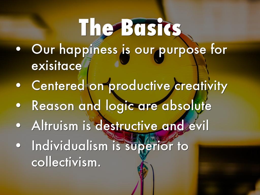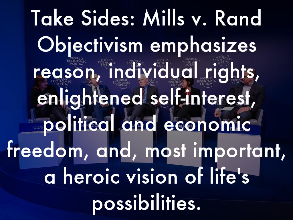 Objectivism emphasizes reason, individual rights, enlightened self-interest, political and economic freedom, and, most important, a heroic vision of life's possibilities.