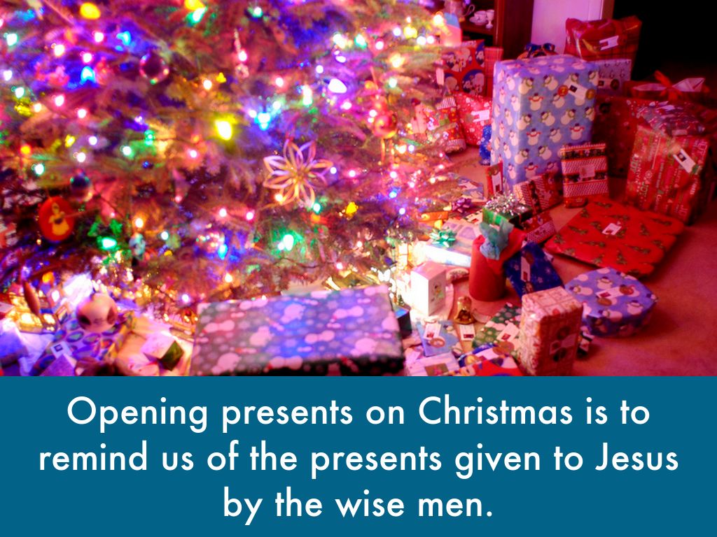 Opening presents on Christmas is to remind us of the presents given to Jesus by the wise men.