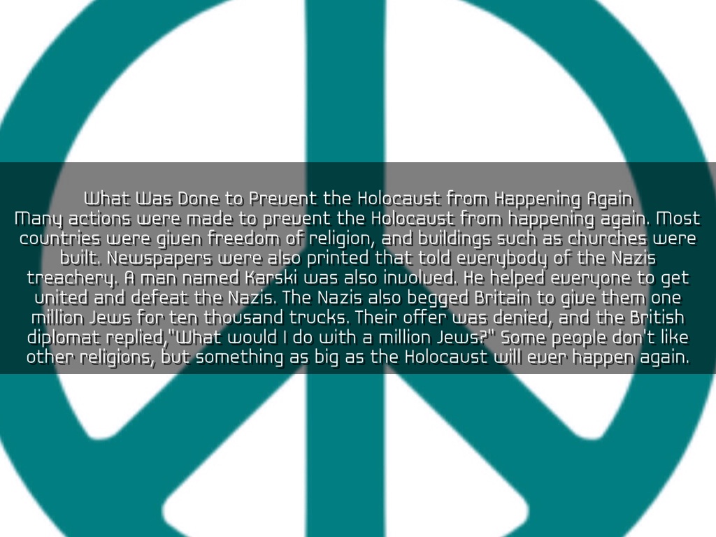 Many actions were made to prevent the Holocaust from happening again. Most countries were given freedom of religion, and buildings such as churches were built. Newspapers were also printed that told everybody of the Nazis treachery. A man named Karski was also involved. He helped everyone to get united and defeat the Nazis. The Nazis also begged Britain to give them one million Jews for ten thousand trucks. Their offer was denied, and the British diplomat replied,"What would I do with a million Jews?" Some people don't like other religions, but something as big as the Holocaust will ever happen again.