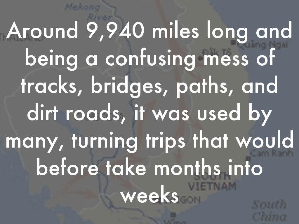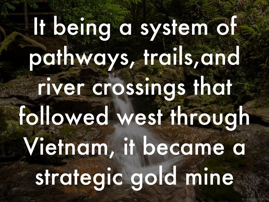 It being a system of pathways, trails,and river crossings that followed west through Vietnam, it became a strategic gold mine