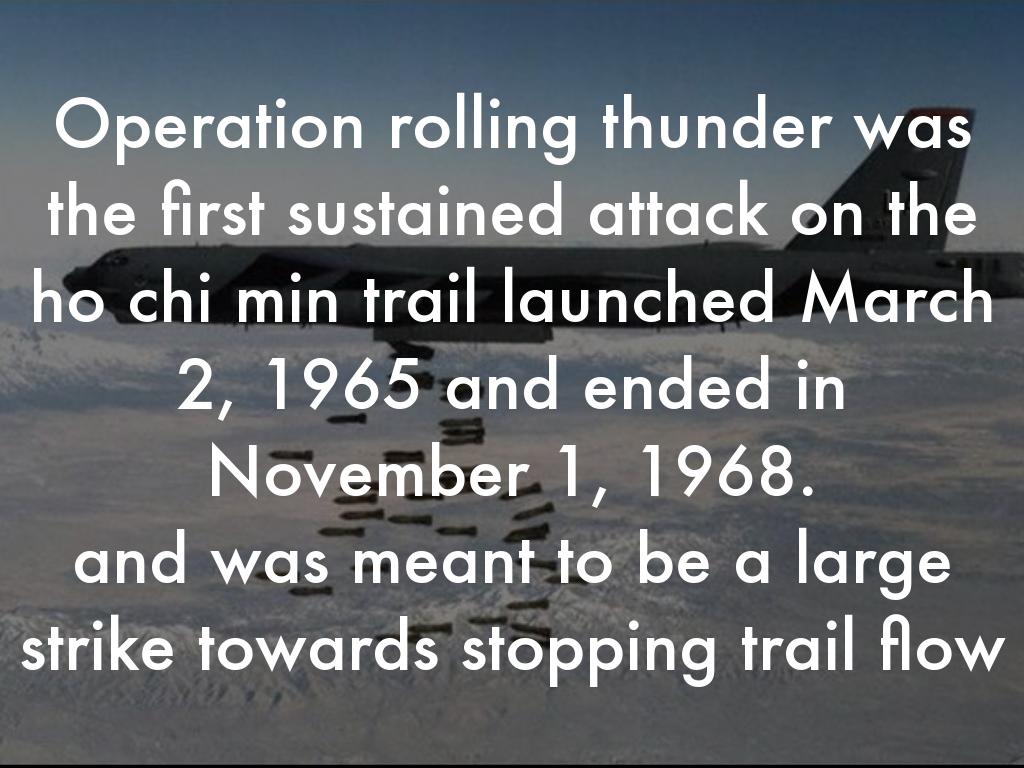 Operation rolling thunder was the first sustained attack on the ho chi min trail launched March 2, 1965 and ended in November 1, 1968.
