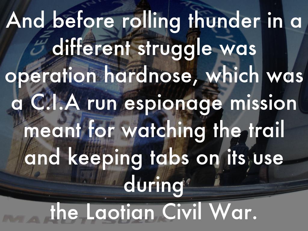 And before rolling thunder in a different struggle was operation hardnose, which was a C.I.A run espionage mission meant for watching the trail and keeping tabs on its use during