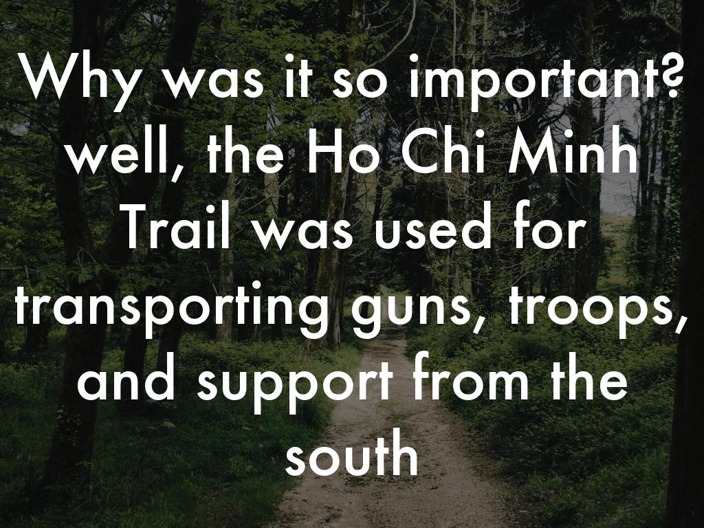 Why was it so important? well, the Ho Chi Minh Trail was used for transporting guns, troops, and support from the south