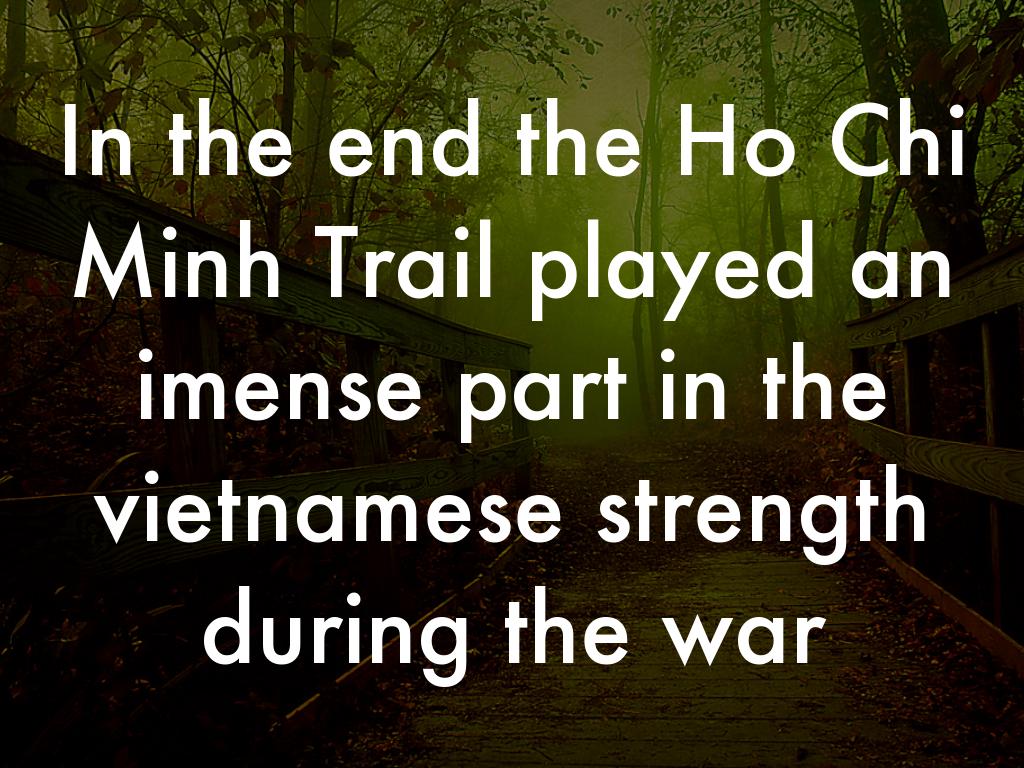 In the end the Ho Chi Minh Trail played an imense part in the vietnamese strength during the war