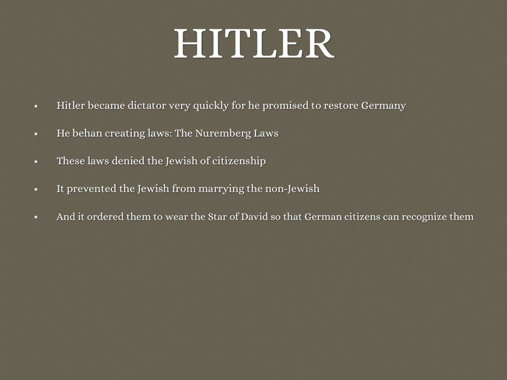 He behan creating laws: The Nuremberg Laws
