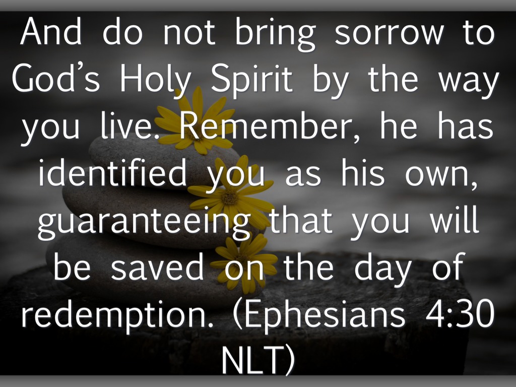 And do not bring sorrow to God’s Holy Spirit by the way you live. Remember, he has identified you as his own, guaranteeing that you will be saved on the day of redemption. (‭Ephesians‬ ‭4‬:‭30‬ NLT)