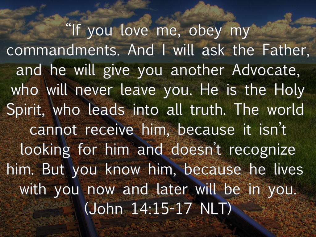 “If you love me, obey my commandments. And I will ask the Father, and he will give you another Advocate, who will never leave you. He is the Holy Spirit, who leads into all truth. The world cannot receive him, because it isn’t looking for him and doesn’t recognize him. But you know him, because he lives with you now and later will be in you. (‭John‬ ‭14‬:‭15-17‬ NLT)