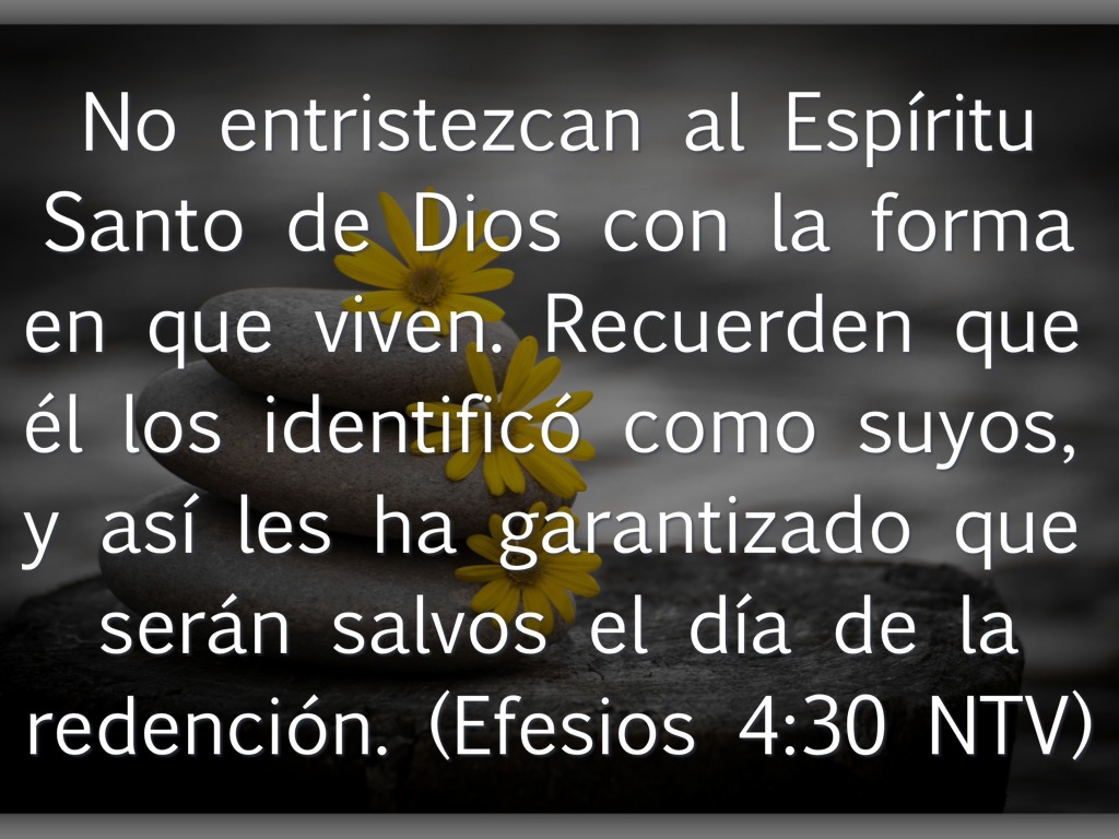 No entristezcan al Espíritu Santo de Dios con la forma en que viven. Recuerden que él los identificó como suyos, y así les ha garantizado que serán salvos el día de la redención. (‭Efesios‬ ‭4‬:‭30‬ NTV)