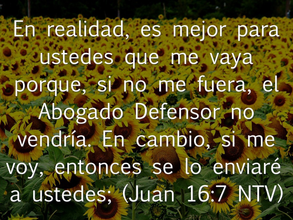 En realidad, es mejor para ustedes que me vaya porque, si no me fuera, el Abogado Defensor no vendría. En cambio, si me voy, entonces se lo enviaré a ustedes; (‭Juan‬ ‭16‬:‭7‬ NTV)