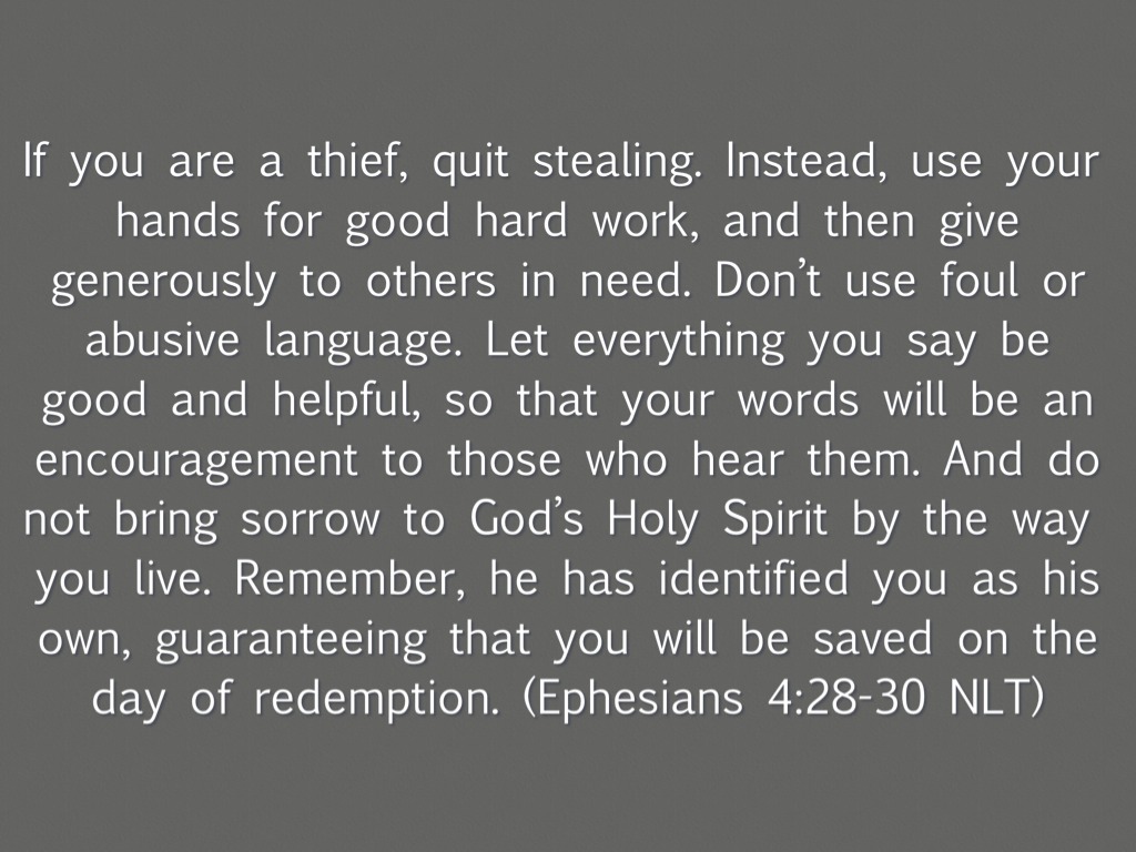 If you are a thief, quit stealing. Instead, use your hands for good hard work, and then give generously to others in need. Don’t use foul or abusive language. Let everything you say be good and helpful, so that your words will be an encouragement to those who hear them. And do not bring sorrow to God’s Holy Spirit by the way you live. Remember, he has identified you as his own, guaranteeing that you will be saved on the day of redemption. (‭Ephesians‬ ‭4‬:‭28-30‬ NLT)