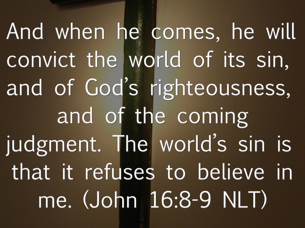 And when he comes, he will convict the world of its sin, and of God’s righteousness, and of the coming judgment. The world’s sin is that it refuses to believe in me. (‭John‬ ‭16‬:‭8-9‬ NLT)