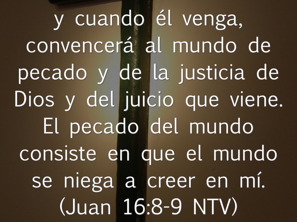 y cuando él venga, convencerá al mundo de pecado y de la justicia de Dios y del juicio que viene. El pecado del mundo consiste en que el mundo se niega a creer en mí. (‭Juan‬ ‭16‬:‭8-9‬ NTV)