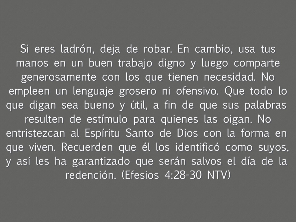 Si eres ladrón, deja de robar. En cambio, usa tus manos en un buen trabajo digno y luego comparte generosamente con los que tienen necesidad. No empleen un lenguaje grosero ni ofensivo. Que todo lo que digan sea bueno y útil, a fin de que sus palabras resulten de estímulo para quienes las oigan. No entristezcan al Espíritu Santo de Dios con la forma en que viven. Recuerden que él los identificó como suyos, y así les ha garantizado que serán salvos el día de la redención. (‭Efesios‬ ‭4‬:‭28-30‬ NTV)