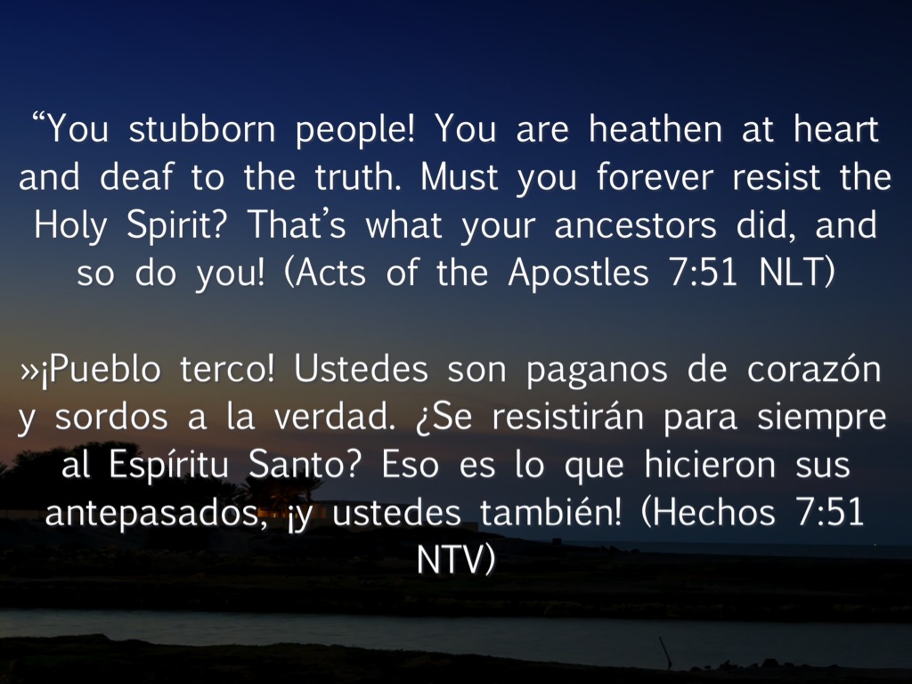 “You stubborn people! You are heathen at heart and deaf to the truth. Must you forever resist the Holy Spirit? That’s what your ancestors did, and so do you! (‭Acts of the Apostles‬ ‭7‬:‭51‬ NLT)