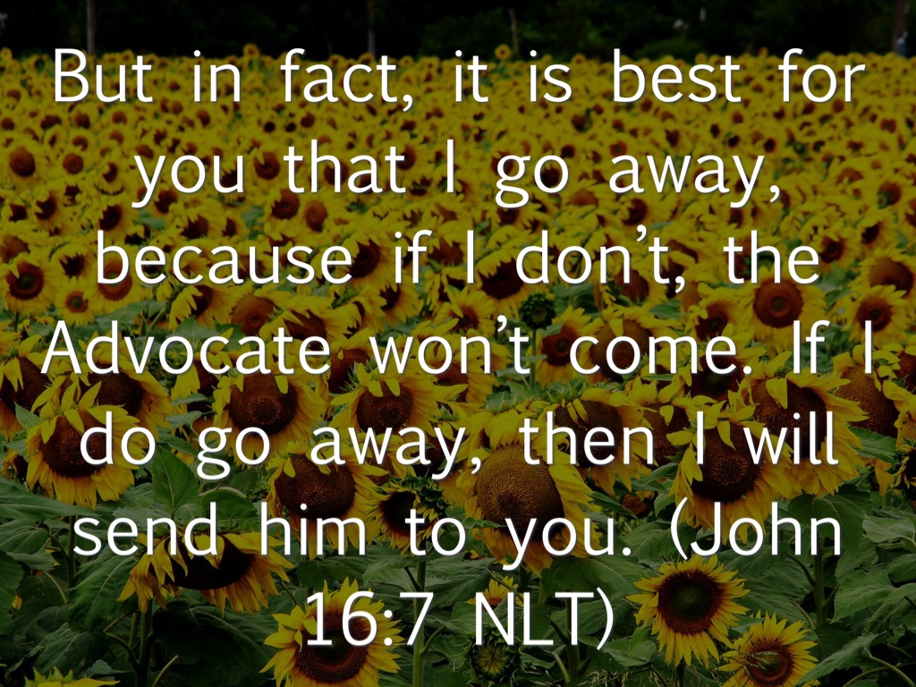 But in fact, it is best for you that I go away, because if I don’t, the Advocate won’t come. If I do go away, then I will send him to you. (‭John‬ ‭16‬:‭7‬ NLT)