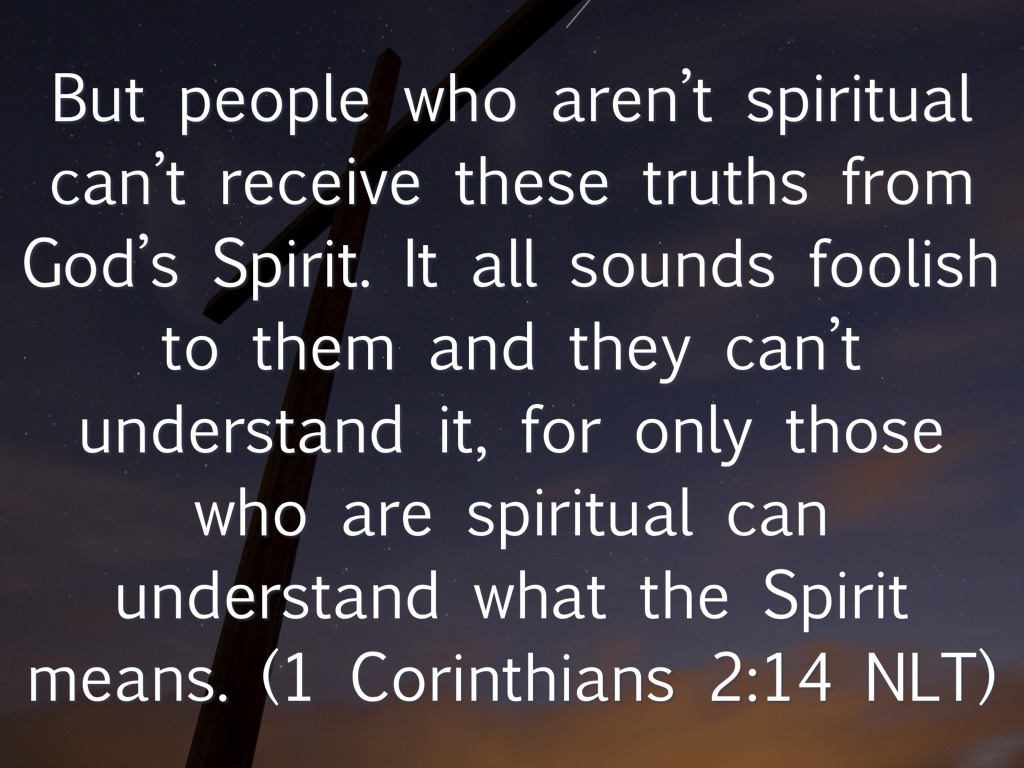 But people who aren’t spiritual can’t receive these truths from God’s Spirit. It all sounds foolish to them and they can’t understand it, for only those who are spiritual can understand what the Spirit means. (‭1 Corinthians‬ ‭2‬:‭14‬ NLT)