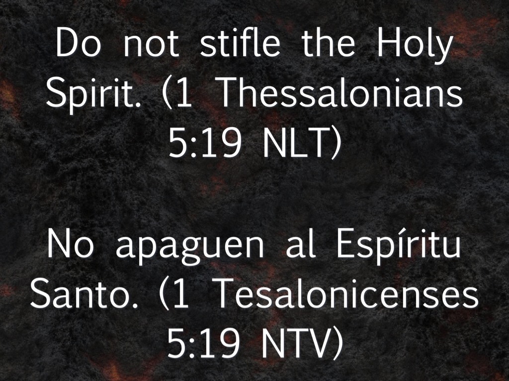 Do not stifle the Holy Spirit. (‭1 Thessalonians‬ ‭5‬:‭19‬ NLT)