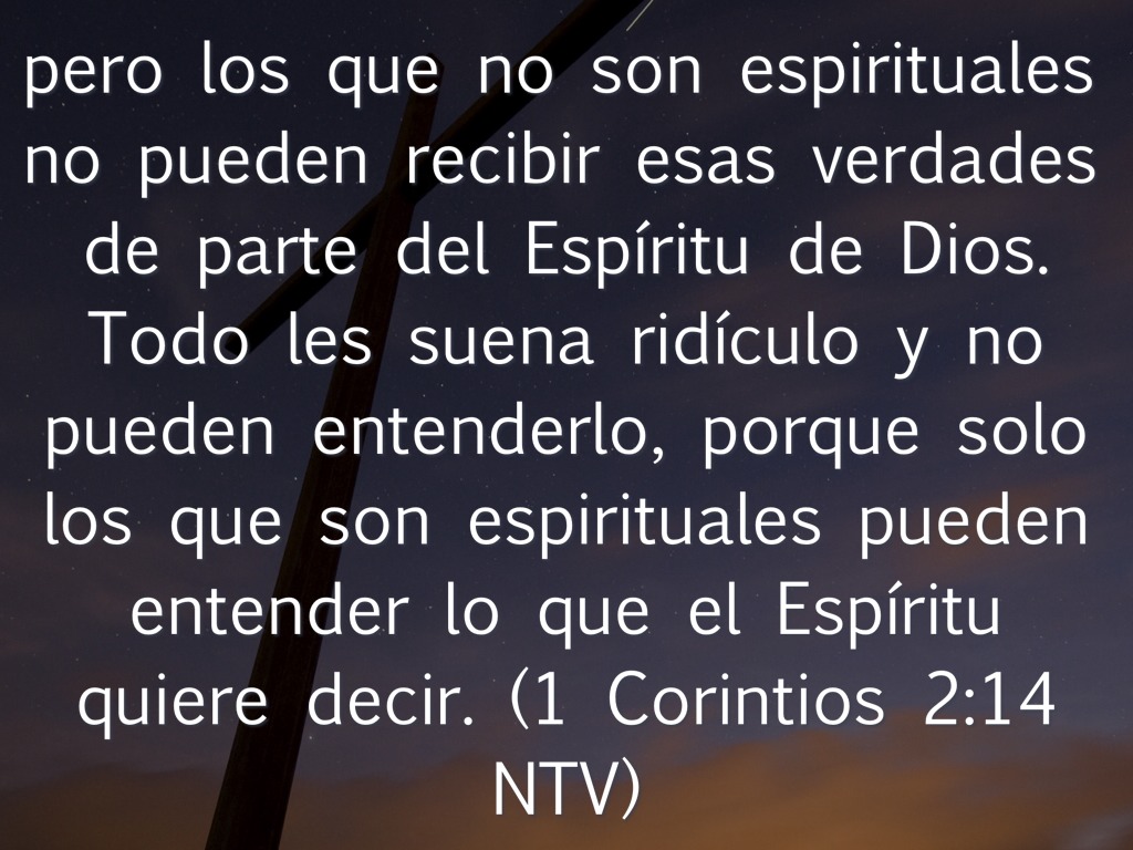 pero los que no son espirituales no pueden recibir esas verdades de parte del Espíritu de Dios. Todo les suena ridículo y no pueden entenderlo, porque solo los que son espirituales pueden entender lo que el Espíritu quiere decir. (‭1 Corintios‬ ‭2‬:‭14‬ NTV)