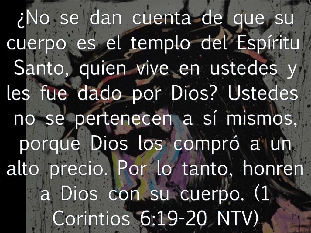 ¿No se dan cuenta de que su cuerpo es el templo del Espíritu Santo, quien vive en ustedes y les fue dado por Dios? Ustedes no se pertenecen a sí mismos, porque Dios los compró a un alto precio. Por lo tanto, honren a Dios con su cuerpo. (‭1 Corintios‬ ‭6‬:‭19-20‬ NTV)