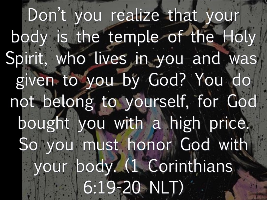 Don’t you realize that your body is the temple of the Holy Spirit, who lives in you and was given to you by God? You do not belong to yourself, for God bought you with a high price. So you must honor God with your body. (‭1 Corinthians‬ ‭6‬:‭19-20‬ NLT)
