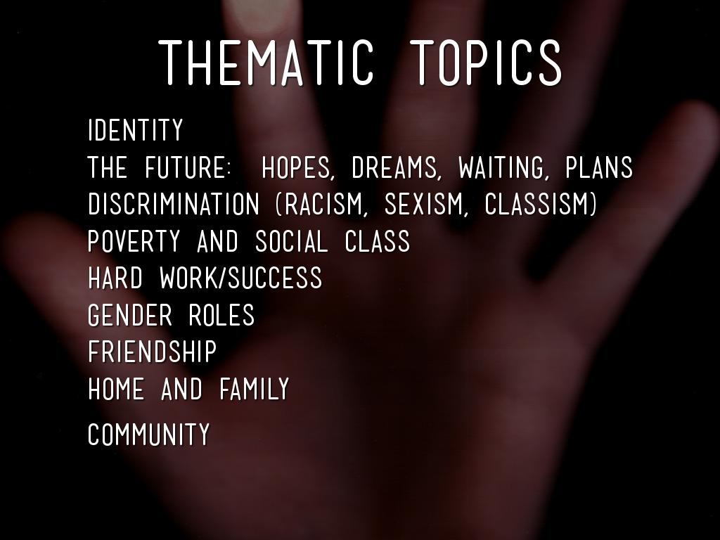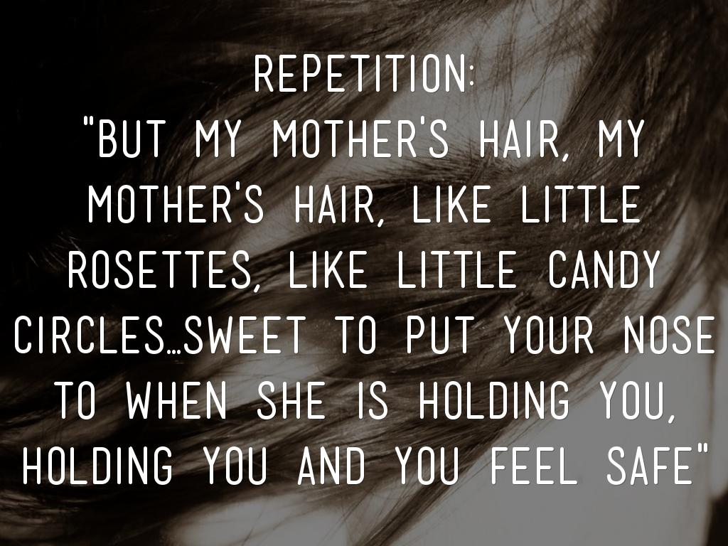 Repetition: "But my mother's hair, my mother's hair, like little rosettes, like little candy circles...sweet to put your nose to when she is holding you, holding you and you feel safe"
