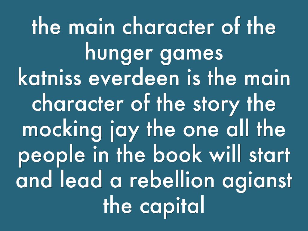 katniss everdeen is the main character of the story the mocking jay the one all the people in the book will start and lead a rebellion agianst the capital
