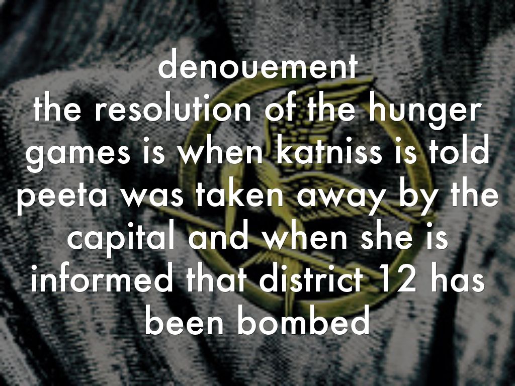 the resolution of the hunger games is when katniss is told peeta was taken away by the capital and when she is informed that district 12 has been bombed