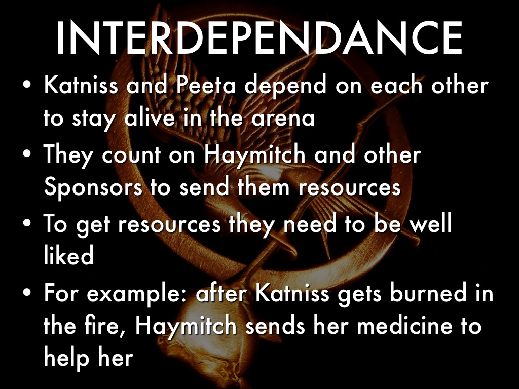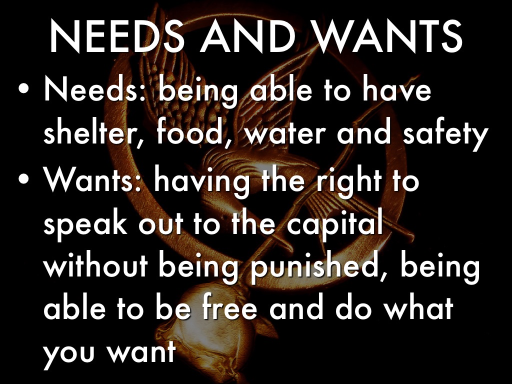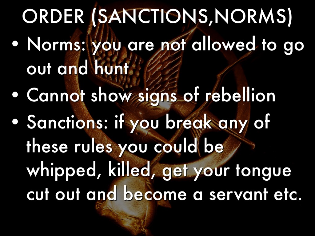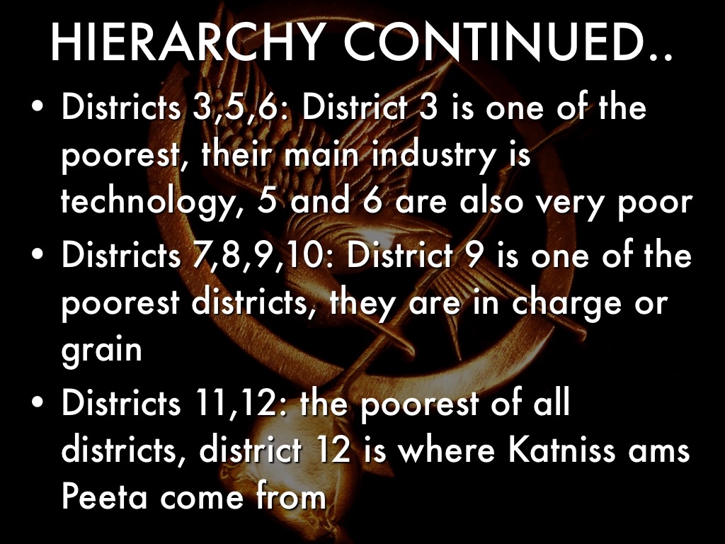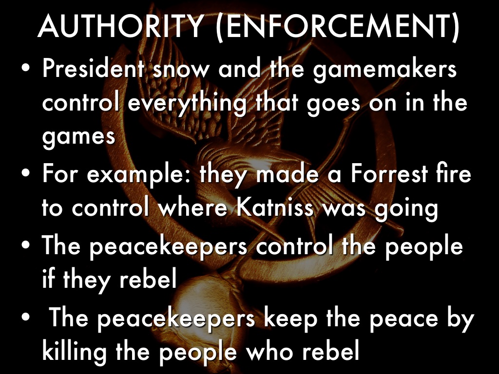 Capitol: the Capitol is led by president snow and hold total political and economic dominance over Panem,rules are enforced through an army of peacekeepers