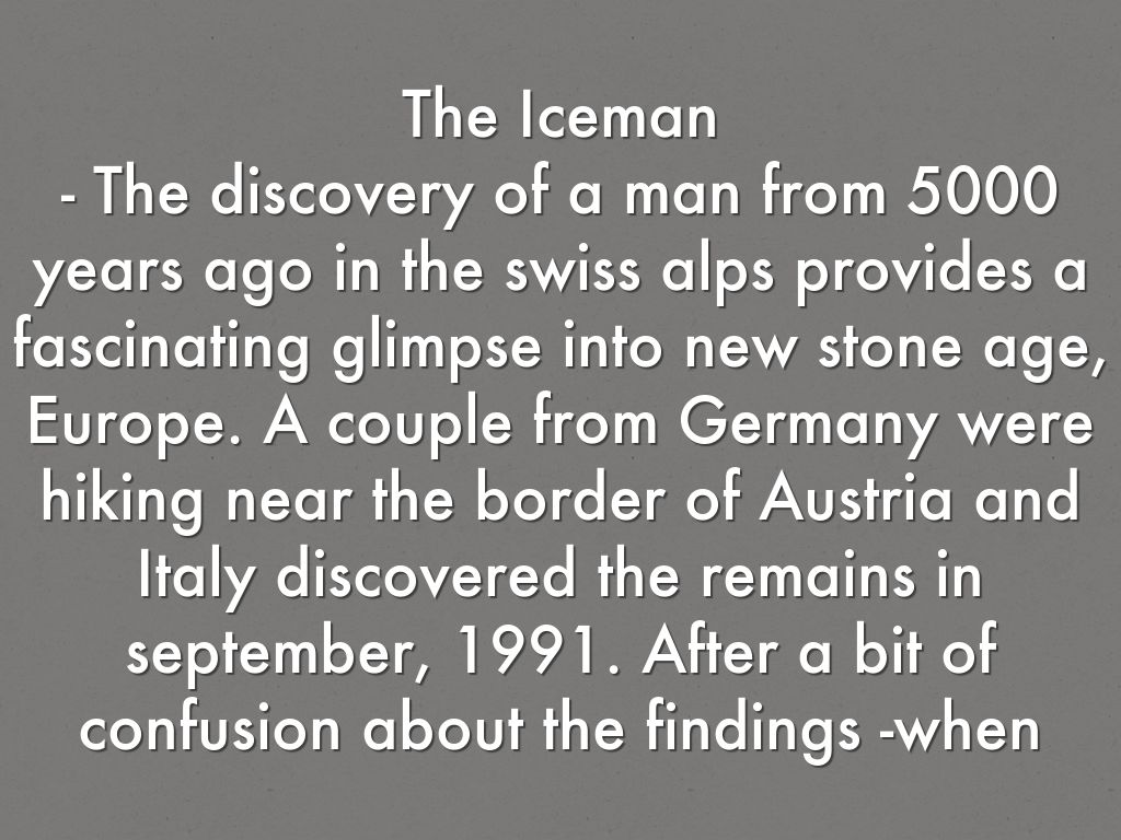 - The discovery of a man from 5000 years ago in the swiss alps provides a fascinating glimpse into new stone age, Europe. A couple from Germany were hiking near the border of Austria and Italy discovered the remains in september, 1991. After a bit of confusion about the findings -whether this was recent or