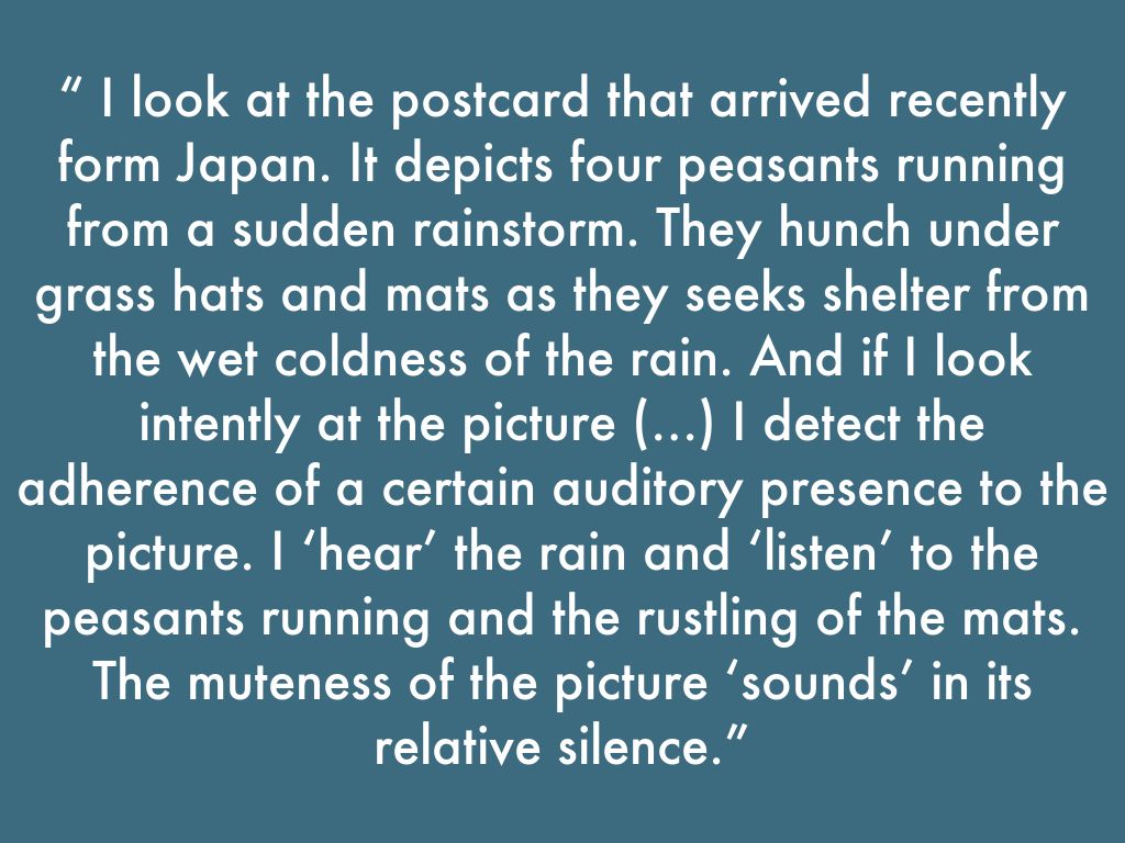 “Language has great difficulty in locating sound and finds it hard to testify to its existence. The name “the sound of airplanes landing” is not the sounds name, it is the landing airplanes attribute, and thus I cannot place the validity of the thing of the sound in it, I can not make it an object. “The sound of the airplane” has the function of making us aware of the airplane overhead, that is however not the function of the sound, it is the function of the name “the sound of the airplane”. The sound itself has no function, and so my experience of it, once we disregard the significance of its source, is much harder to locate, and harder even to articulate in language”
