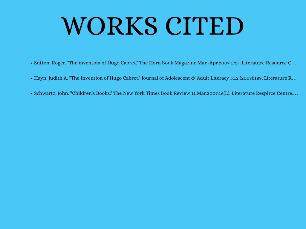 Hayn, Judith A. "The Invention of Hugo Cabret." Journal of Adolescent & Adult Literacy 51.2 (2007):189. Literature Resource Centre.Web 24 Oct.2014.
