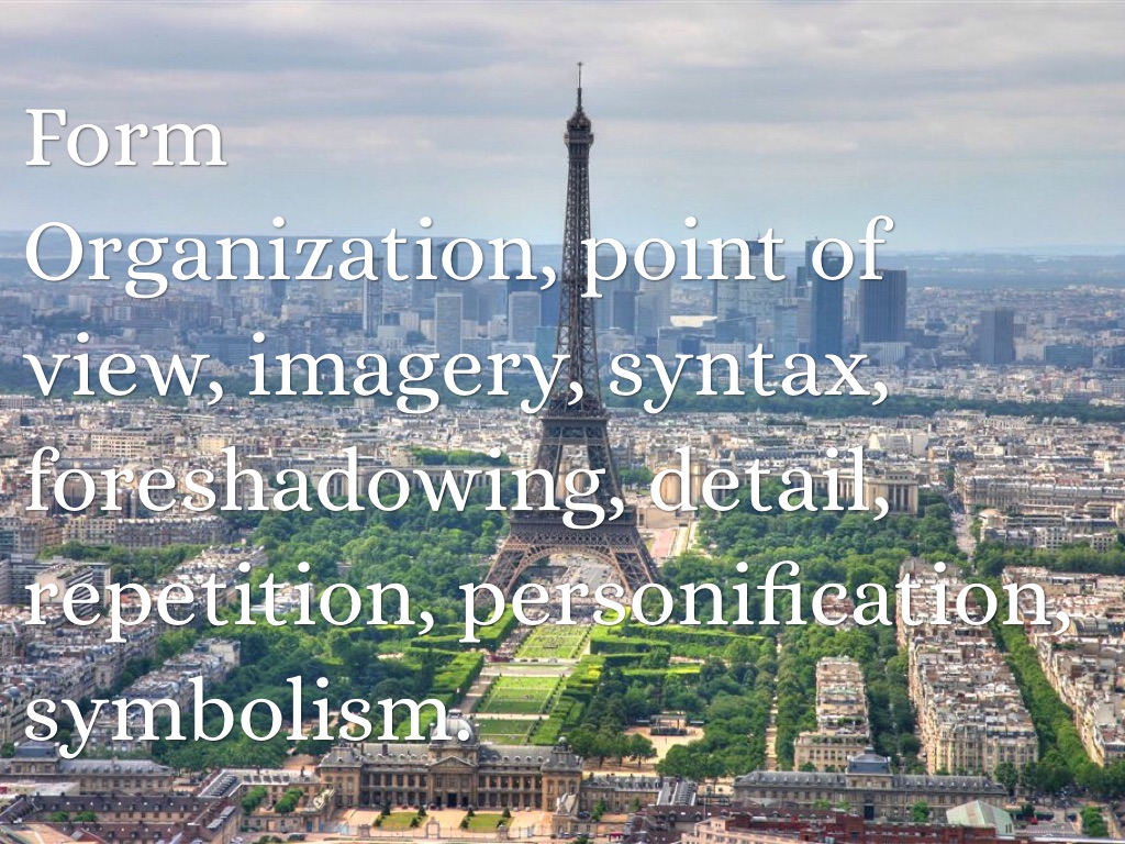 Organization, point of view, imagery, syntax, foreshadowing, detail, repetition, personification, symbolism.