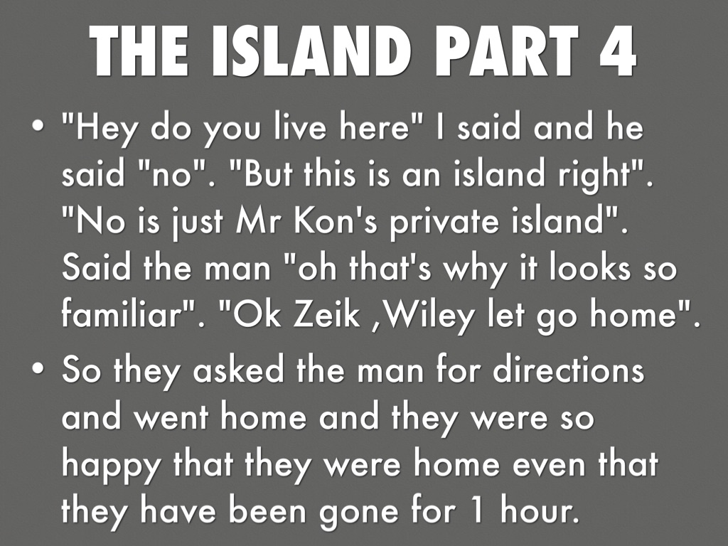 "Hey do you live here" I said and he said "no". "But this is an island right". "No is just Mr Kon's private island". Said the man "oh that's why it looks so familiar". "Ok Zeik ,Wiley let go home".