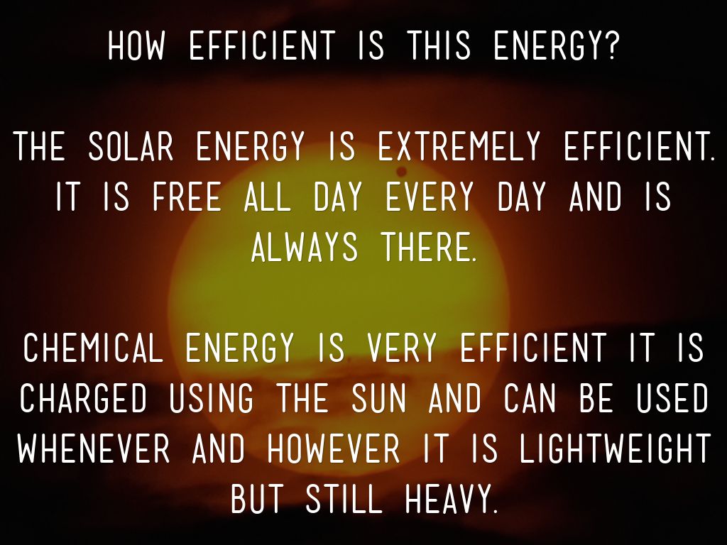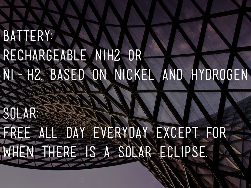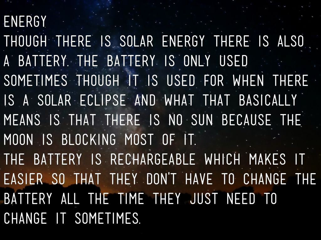 Energy Though there is solar energy there is also a battery. The battery is only used sometimes though it is used for when there is a solar eclipse and what that basically means is that there is no sun because the moon is blocking most of it. The battery is rechargeable which makes it easier so that they don't have to change the battery all the time they just need to change it sometimes.