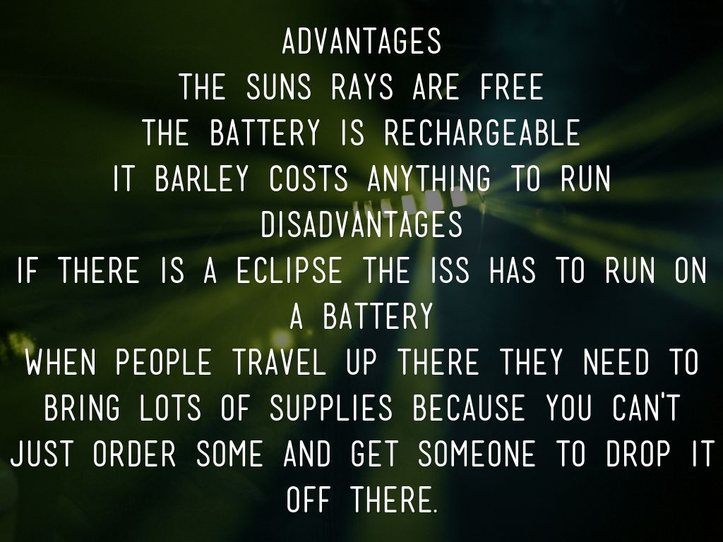 Advantages The Suns rays are free The battery is rechargeable It barley costs anything to run Disadvantages If there is a eclipse the ISS has to run on a battery When people travel up there they need to bring lots of supplies because you can't just order some and get someone to drop it off there.