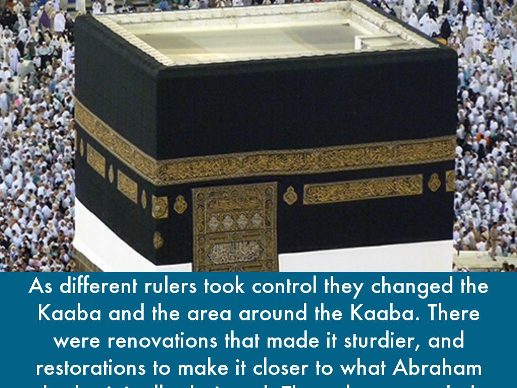 As different rulers took control they changed the Kaaba and the area around the Kaaba. There were renovations that made it sturdier, and restorations to make it closer to what Abraham had originally designed. They also expanded the area around it so that more people could access it at the same time. At one point there was even a school leaning against it.