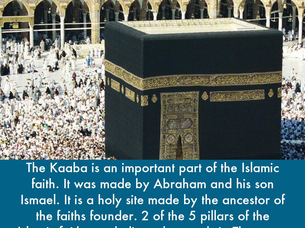 The Kaaba is an important part of the Islamic faith. It was made by Abraham and his son Ismael. It is a holy site made by the ancestor of the faiths founder. 2 of the 5 pillars of the Islamic faith are dedicated towards it. They must visit it at least once in their life, and they must pray towards it twice a day.