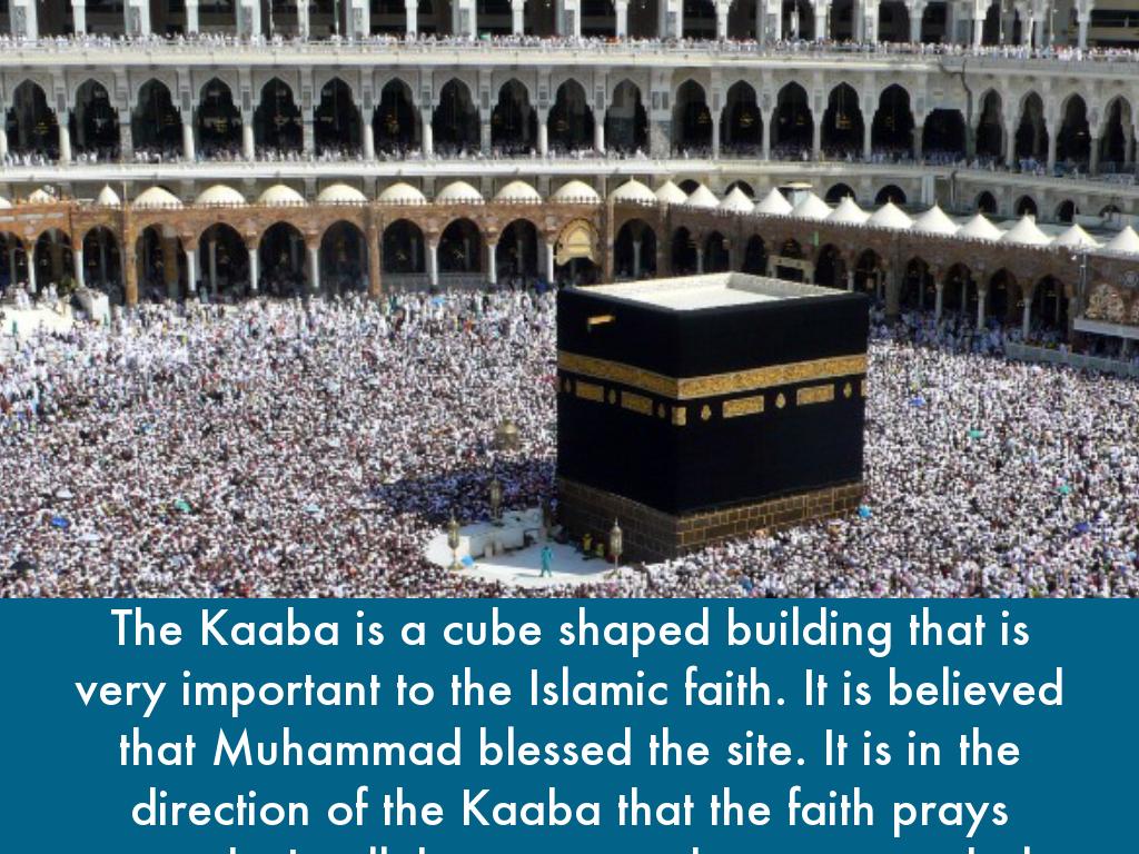 The Kaaba is a cube shaped building that is very important to the Islamic faith. It is believed that Muhammad blessed the site. It is in the direction of the Kaaba that the faith prays towards. In all the mosques there are symbols that point the way to the Kaaba so they know which direction to pray at. Every able person of the faith must visit it at least once in their lifetime.