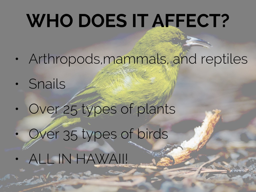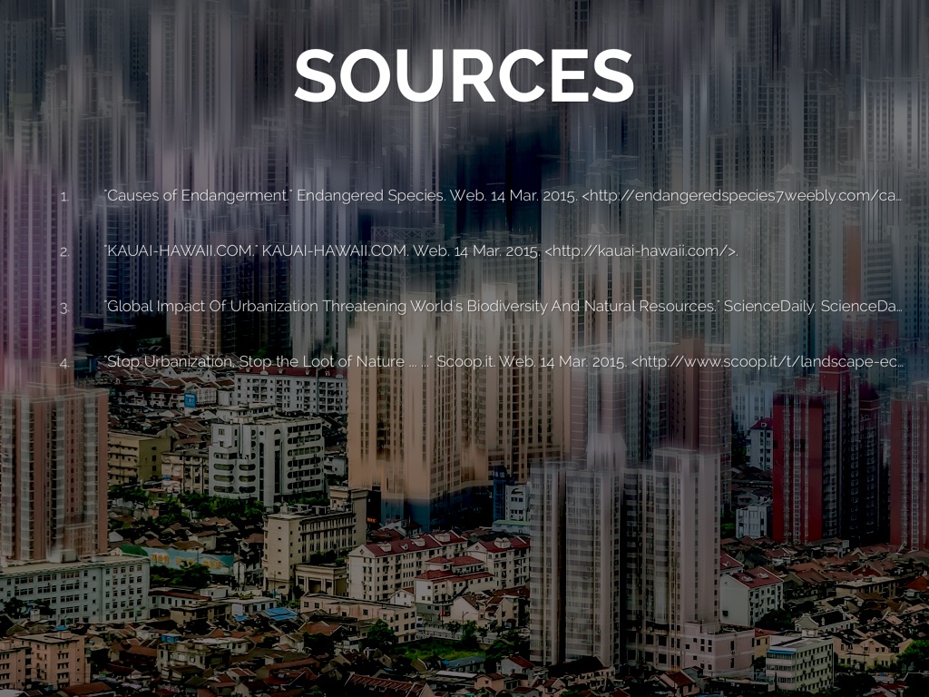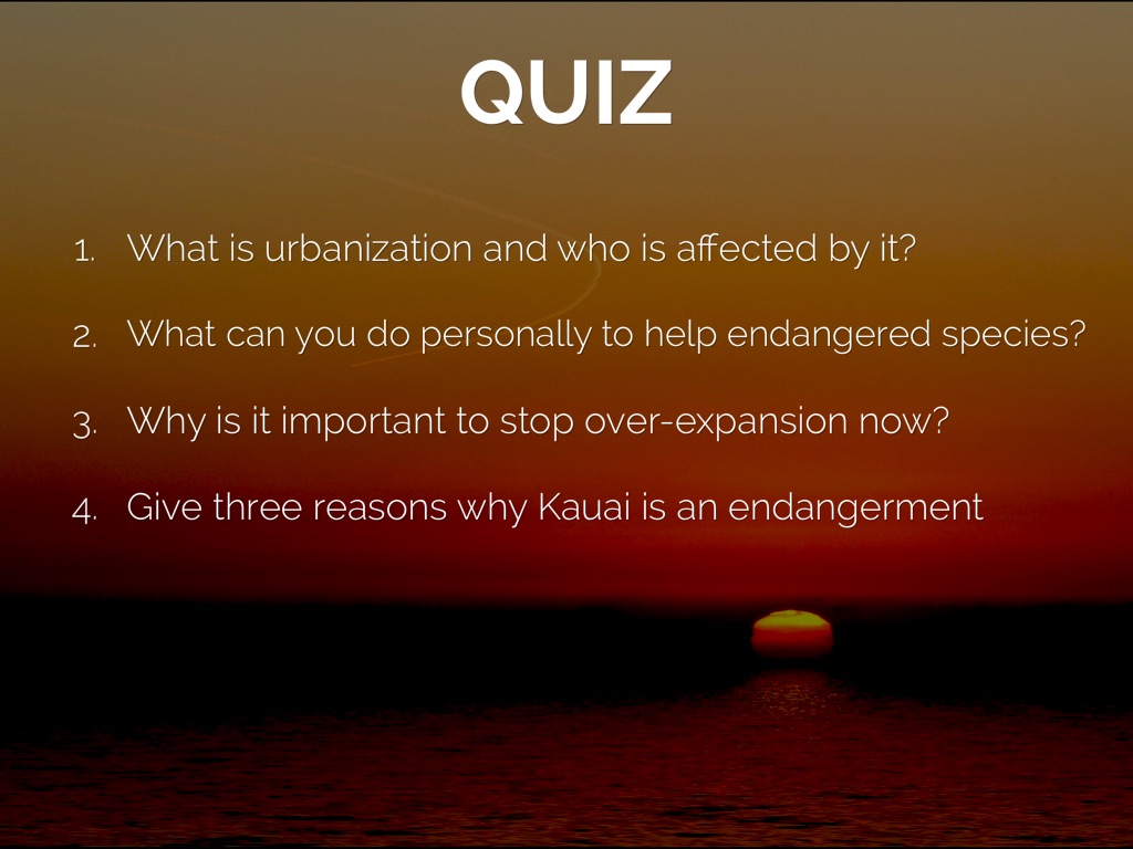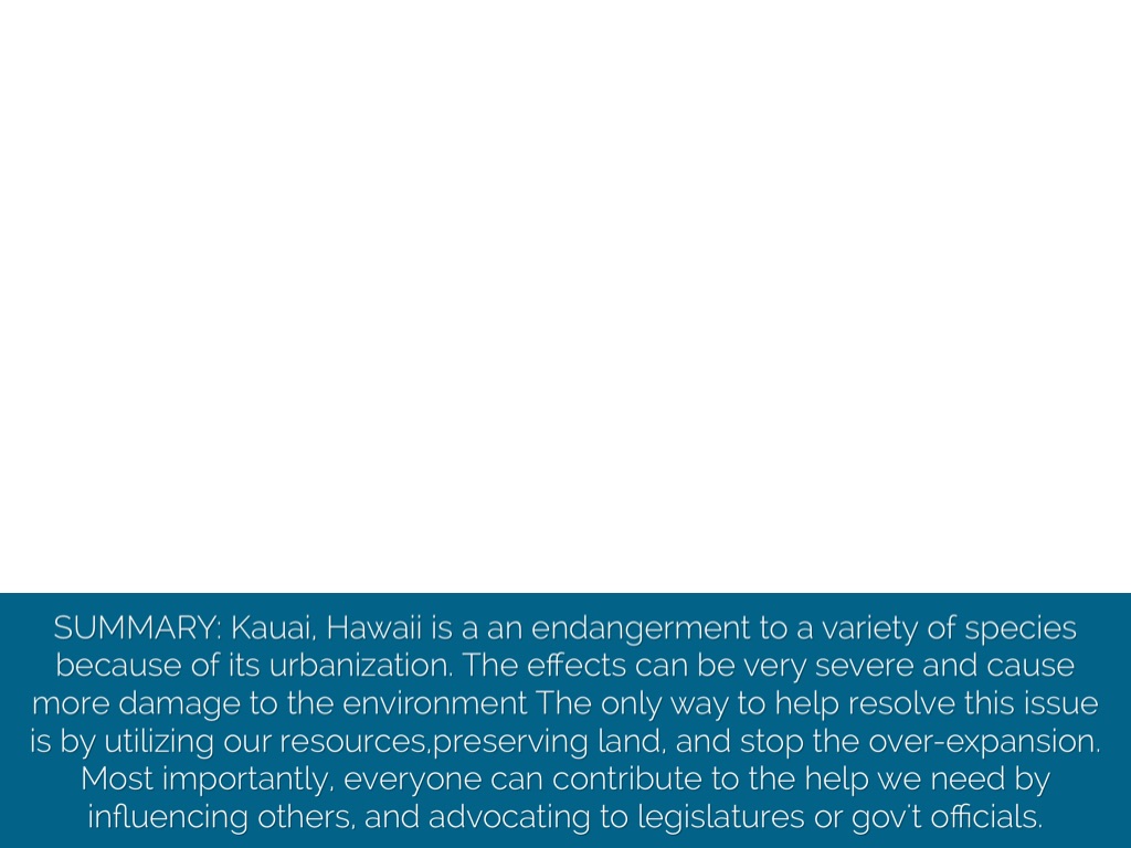 SUMMARY: Kauai, Hawaii is a an endangerment to a variety of species because of its urbanization. The effects can be very severe and cause more damage to the environment The only way to help resolve this issue is by utilizing our resources,preserving land, and stop the over-expansion. Most importantly, everyone can contribute to the help we need by influencing others, and advocating to legislatures or gov't officials.