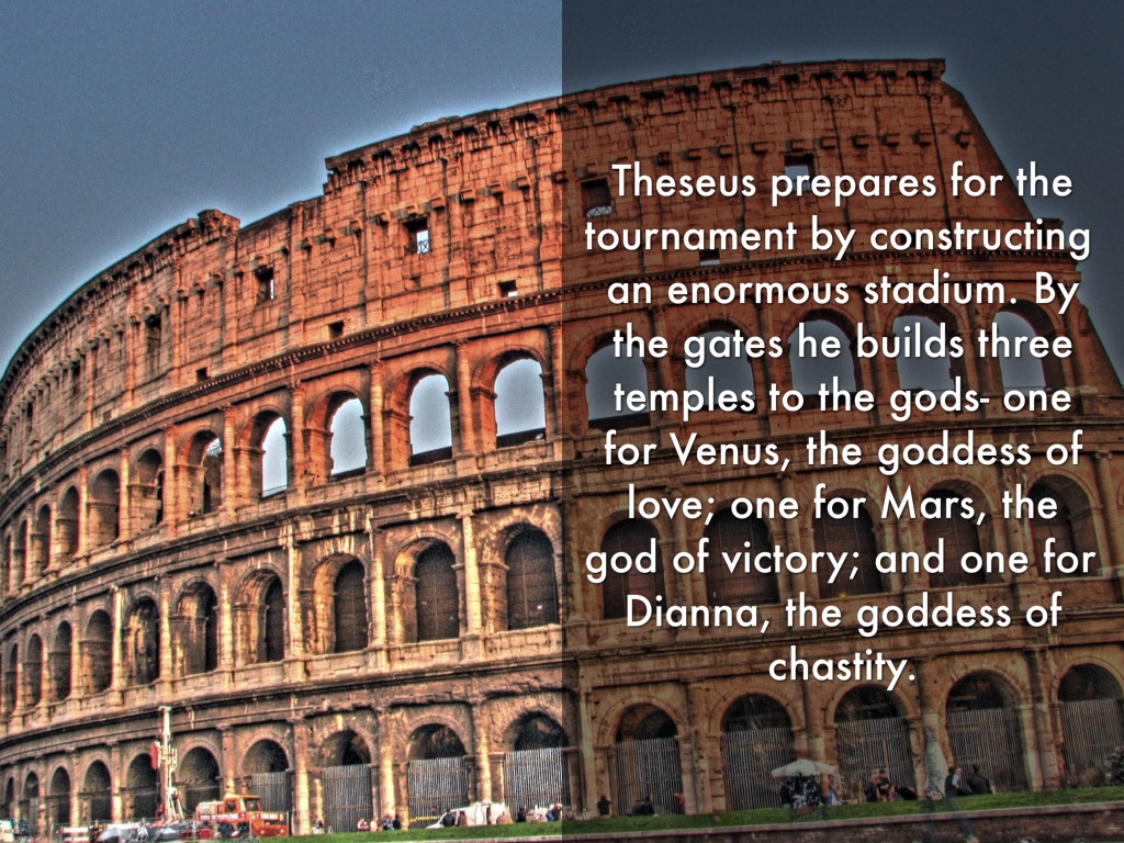 Theseus prepares for the tournament by constructing an enormous stadium. By the gates he builds three temples to the gods- one for Venus, the goddess of love; one for Mars, the god of victory; and one for Dianna, the goddess of chastity.
