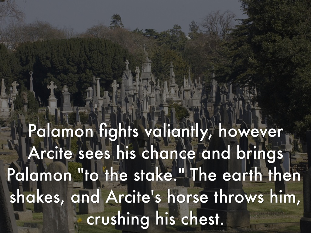 Palamon fights valiantly, however Arcite sees his chance and brings Palamon "to the stake." The earth then shakes, and Arcite's horse throws him, crushing his chest.
