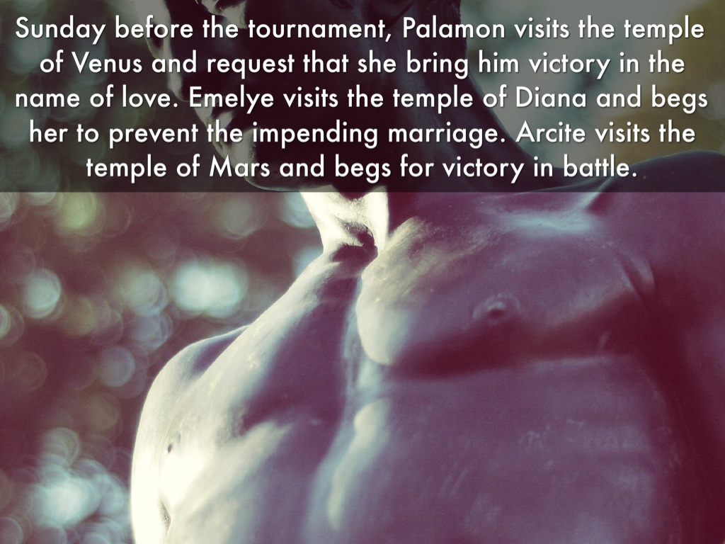 Sunday before the tournament, Palamon visits the temple of Venus and request that she bring him victory in the name of love. Emelye visits the temple of Diana and begs her to prevent the impending marriage. Arcite visits the temple of Mars and begs for victory in battle.