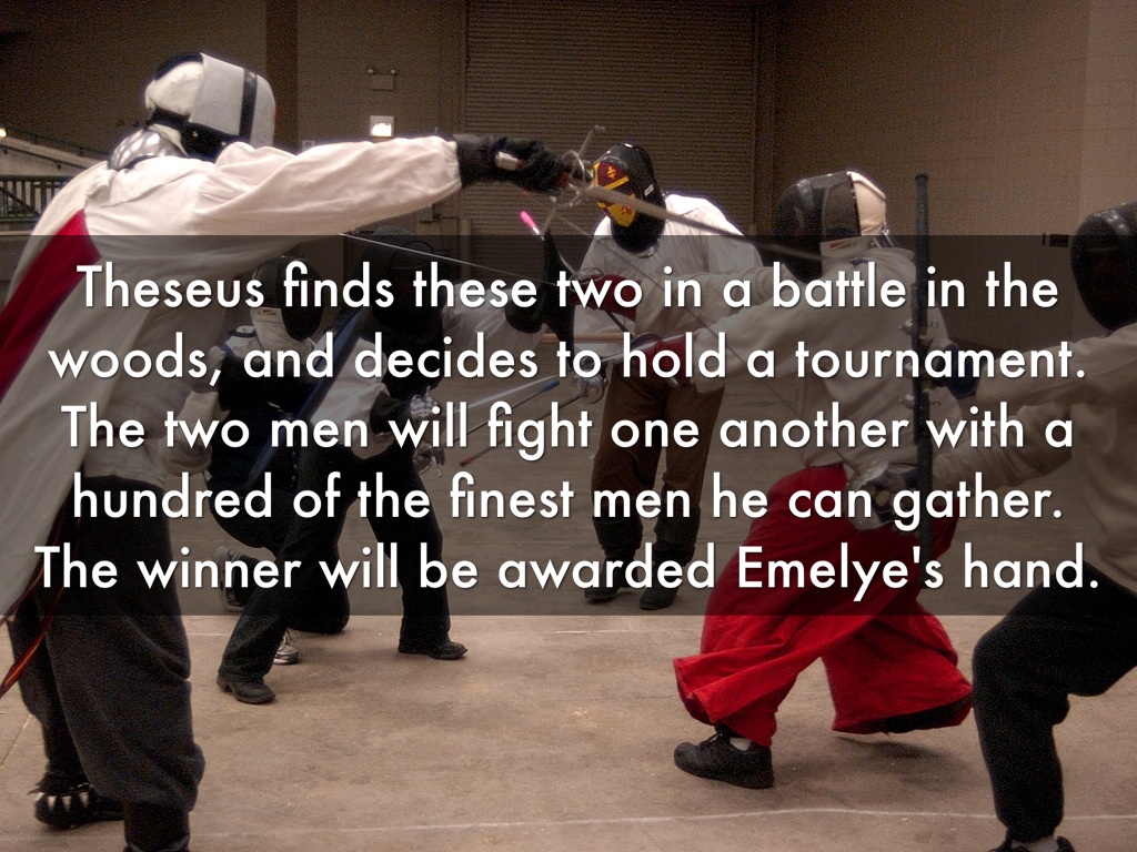 Theseus finds these two in a battle in the woods, and decides to hold a tournament. The two men will fight one another with a hundred of the finest men he can gather. The winner will be awarded Emelye's hand.