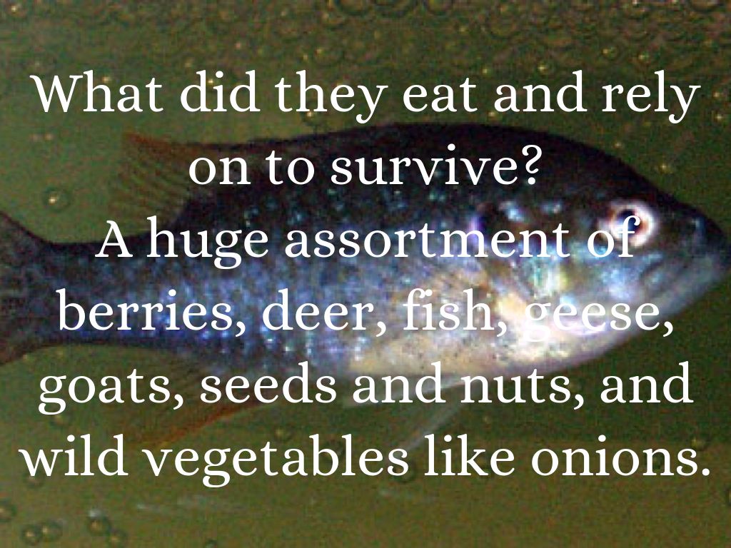 A huge assortment of berries, deer, fish, geese, goats, seeds and nuts, and wild vegetables like onions.