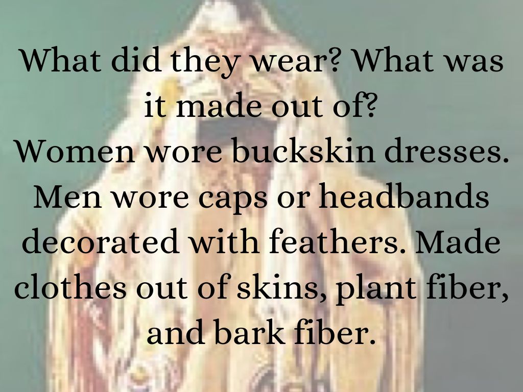 Women wore buckskin dresses. Men wore caps or headbands decorated with feathers. Made clothes out of skins, plant fiber, and bark fiber.