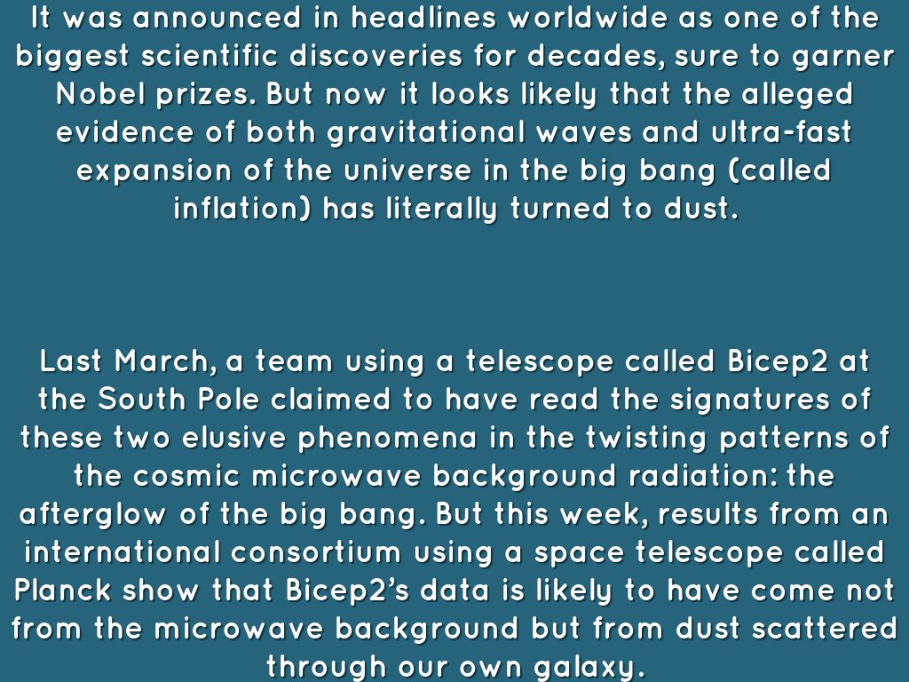 It was announced in headlines worldwide as one of the biggest scientific discoveries for decades, sure to garner Nobel prizes. But now it looks likely that the alleged evidence of both gravitational waves and ultra-fast expansion of the universe in the big bang (called inflation) has literally turned to dust.