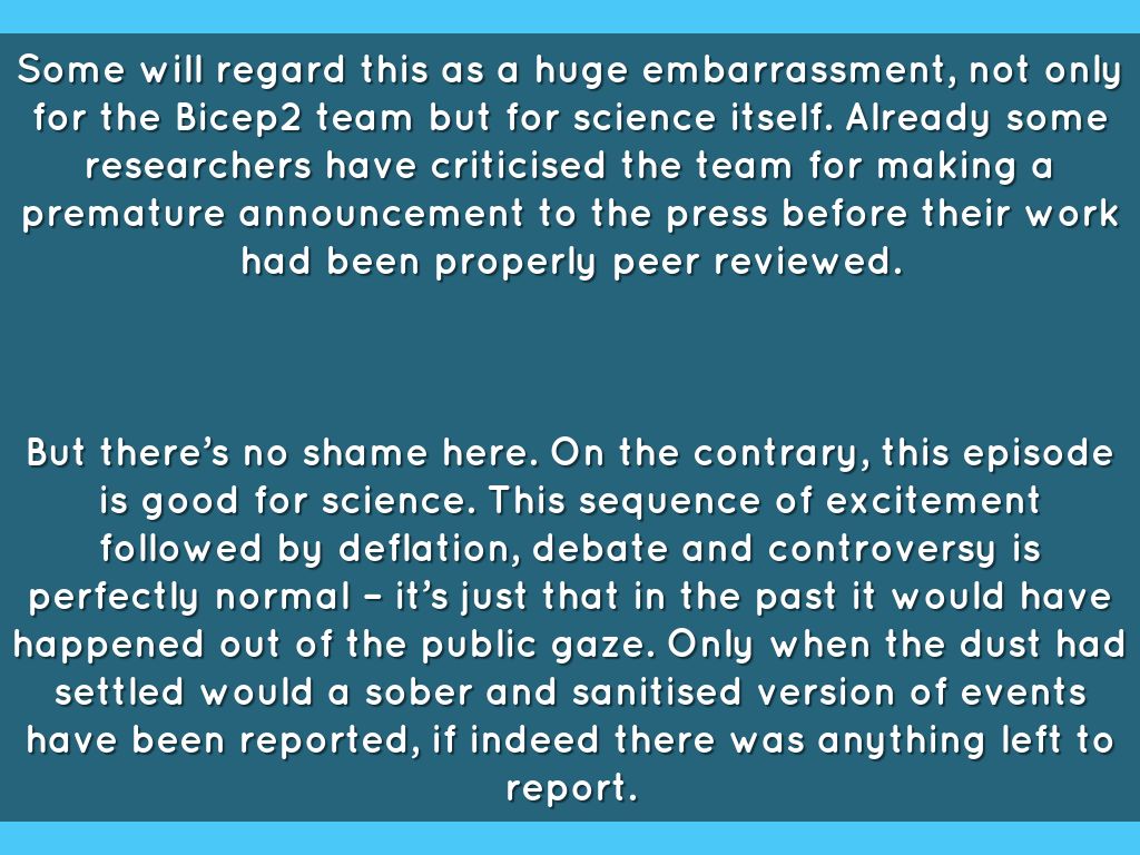 But there’s no shame here. On the contrary, this episode is good for science. This sequence of excitement followed by deflation, debate and controversy is perfectly normal – it’s just that in the past it would have happened out of the public gaze. Only when the dust had settled would a sober and sanitised version of events have been reported, if indeed there was anything left to report.