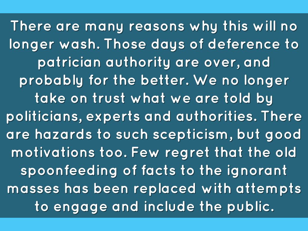 There are many reasons why this will no longer wash. Those days of deference to patrician authority are over, and probably for the better. We no longer take on trust what we are told by politicians, experts and authorities. There are hazards to such scepticism, but good motivations too. Few regret that the old spoonfeeding of facts to the ignorant masses has been replaced with attempts to engage and include the public.