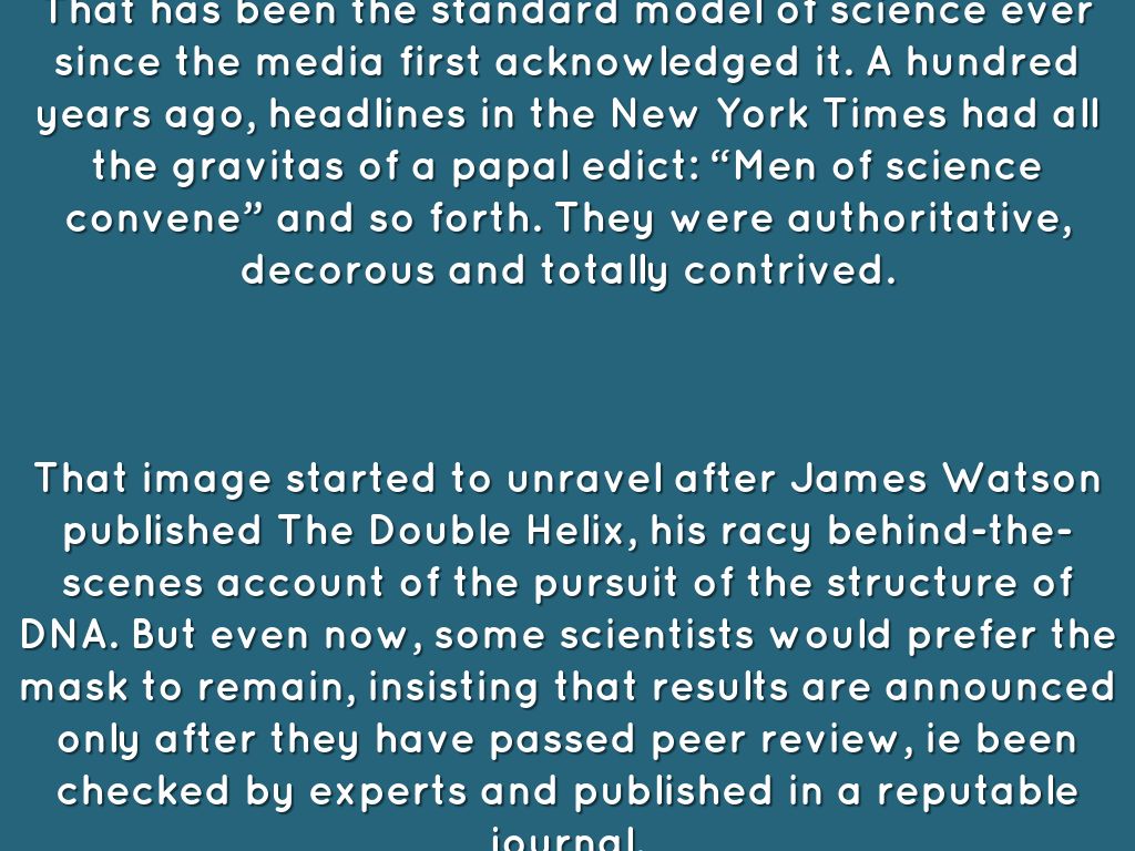 That image started to unravel after James Watson published The Double Helix, his racy behind-the-scenes account of the pursuit of the structure of DNA. But even now, some scientists would prefer the mask to remain, insisting that results are announced only after they have passed peer review, ie been checked by experts and published in a reputable journal.