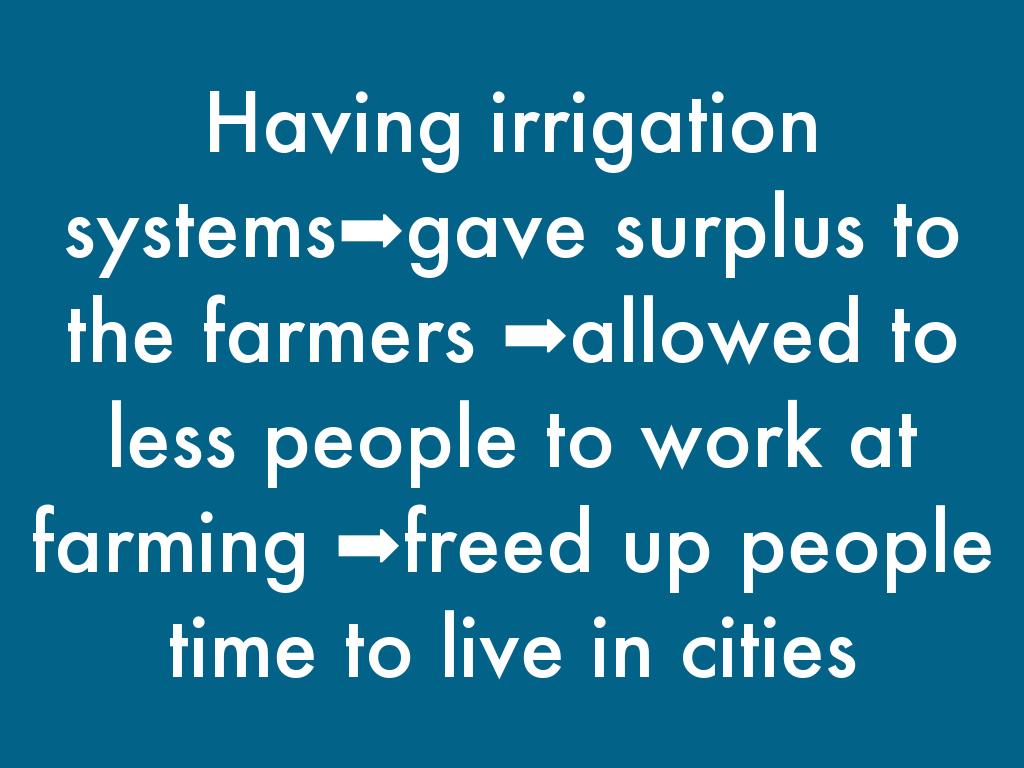 Having irrigation systems➡️gave surplus to the farmers ➡️allowed to less people to work at farming ➡️freed up people time to live in cities
